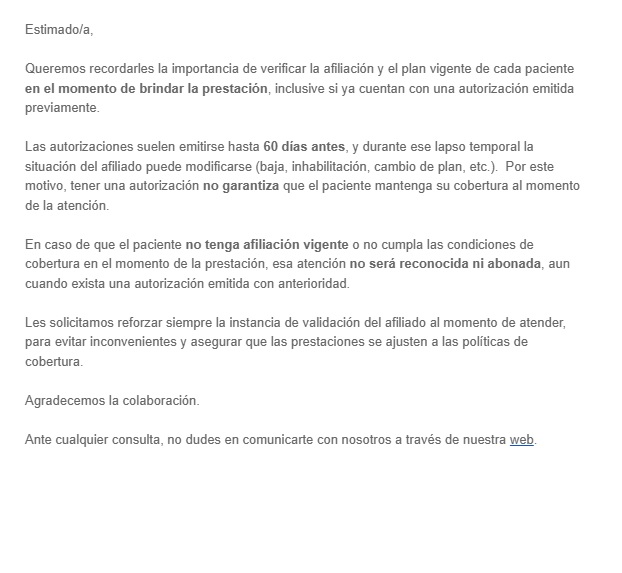 Estimado prestador Por la presente se informa, que a partir del 1/06/24, los afiliados con plan PMO deberán abonar los coseguros que establece la superintendencia de salud (https://www.argentina.gob.ar/sssalud/valores-coseguros ).- Los mismos deben ser descontados de la facturación.- Saludos cordiales