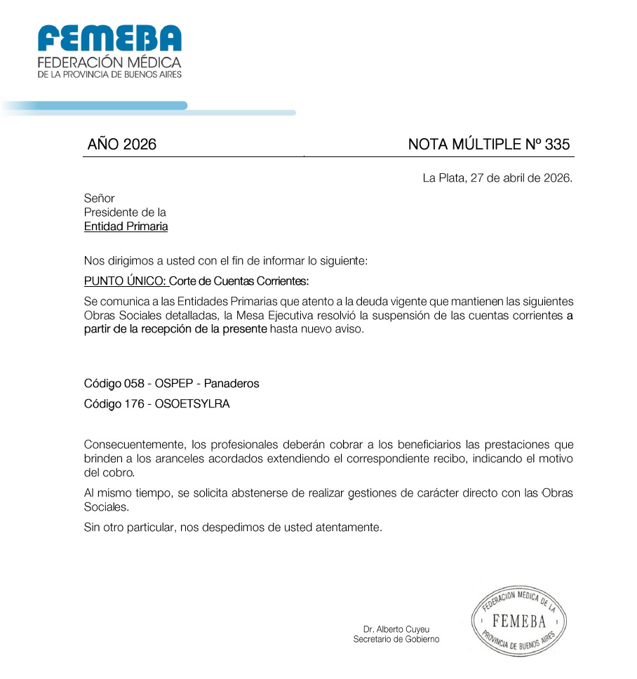 Se informa el corte de las siguientes obras sociales: 058 - OSPEP Panaderos (desde 27/04/2026) 176 - OSOETSYLRA (desde 27/04/2026) Continúan los cortes mencionados en el adjunto.